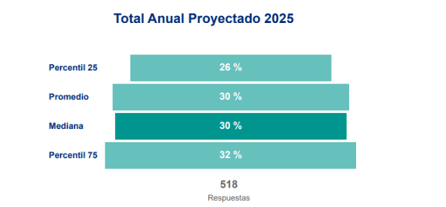 La mediana del presupuesto anual de incrementos salariales para 2025 se ubica en 30%, alineándose con la proyección de inflación estimada por Latin Focus, que fue del 29,7%.