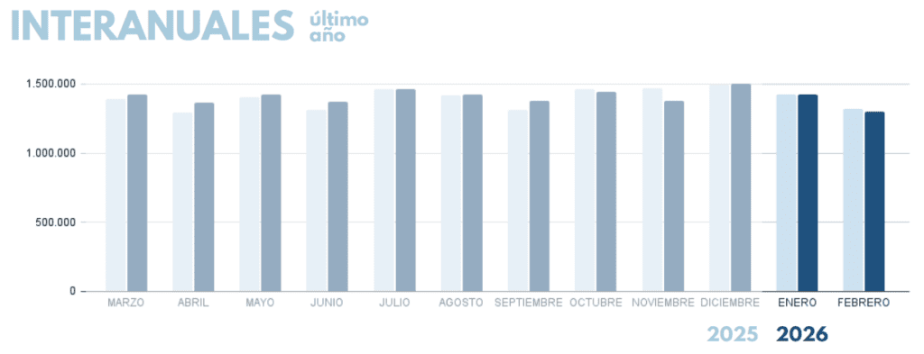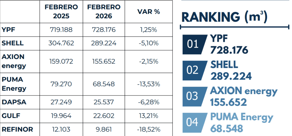 Se comercializaron 1.299.600 m³, frente a 1.321.608 m³ del mismo mes de 2025, lo que significó un descenso del 1,67 por ciento interanual.