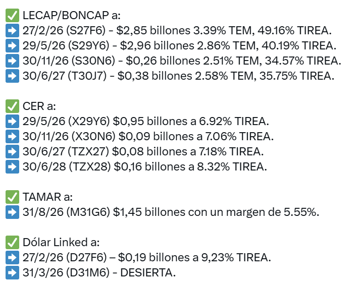 La Secretaría de Finanzas tuvo su primera prueba del 2026 con un nivel de adjudicación de $9,37 billones habiendo recibido ofertas por un total de $10,06 billones. Esto significa un rollover de 98% sobre los vencimientos del día de la fecha.