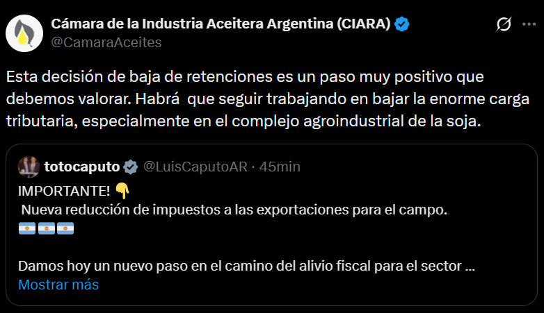 «Esta decisión de baja de retenciones es un paso muy positivo que debemos valorar. Habrá que seguir trabajando en bajar la enorme carga tributaria, especialmente en el complejo agroindustrial de la soja.