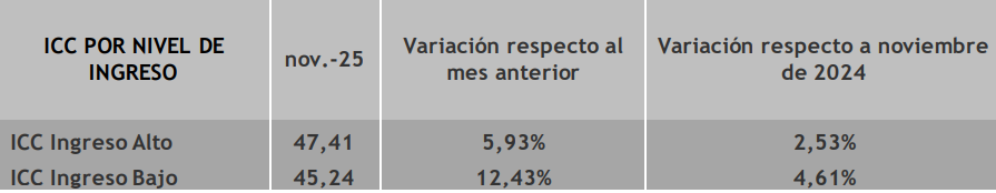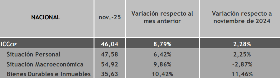 El Indice de Confianza del Consumidor se situó en 46,04 en noviembre, lo que representa un aumento mensual de 8,79%. Esta mejora continúa el proceso de recuperación iniciado en octubre: en dos meses el ICC subió 15,65%.